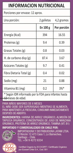 Harina de arroz orgánica, Almidón de tapioca orgánico, Concentrado de jugo de manzana orgánico, Proteína de arroz orgánico, Tiamina vit b1