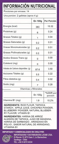 Harina de arroz, almidón de tapioca, jugo de manzana, harina de garbanzo, arándano en polvo, sabor natural de arándano, vitamina B1.