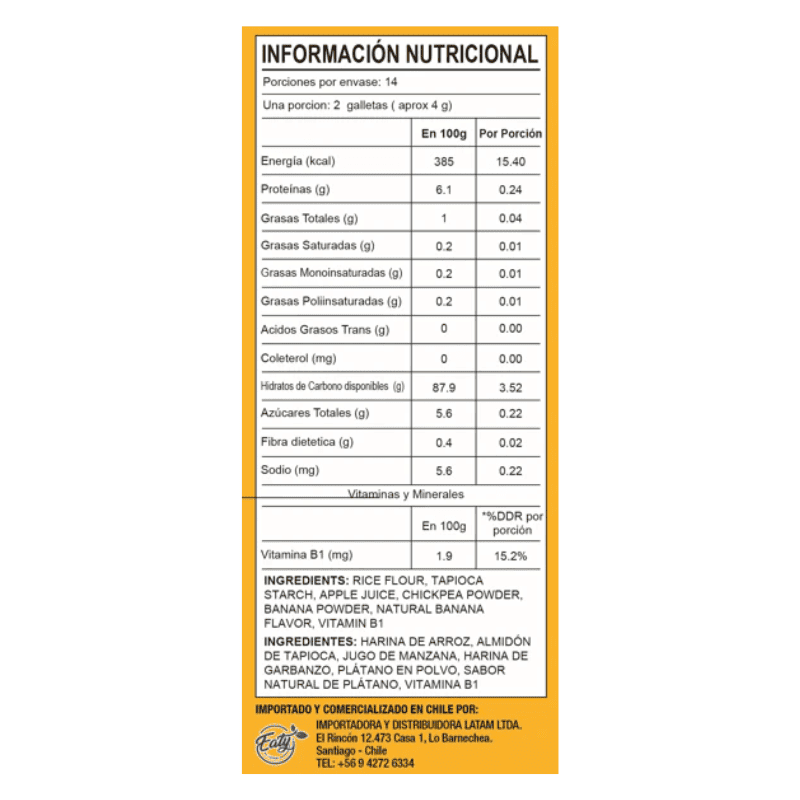Harina de arroz, almidón de tapioca, jugo de manzana, harina de garbanzo, plátano en polvo, sabor natural de plátano, vitamina B1.