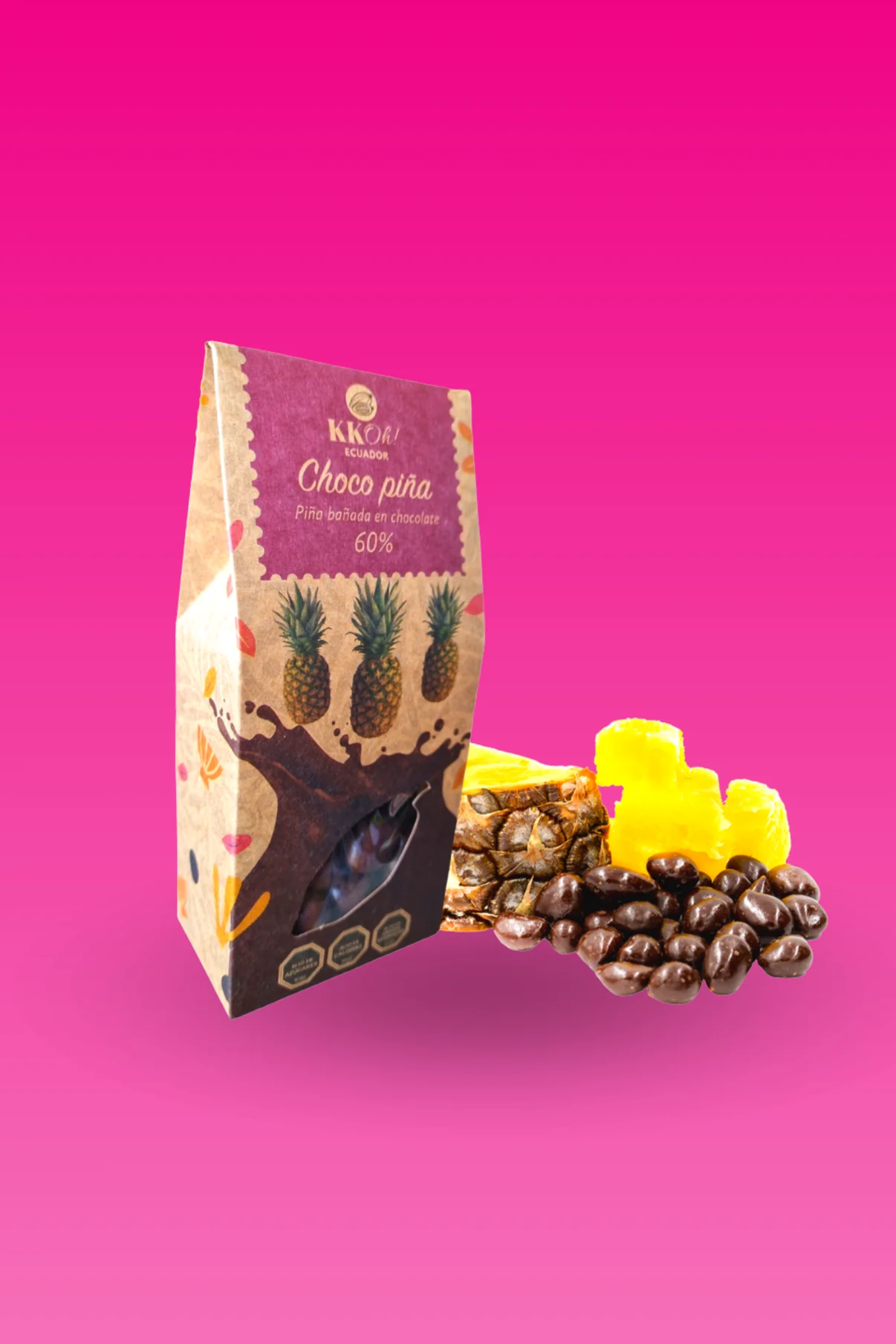 Trozos de piña deshidratada, cubiertos en chocolate 60% sin gluten, sin leche.