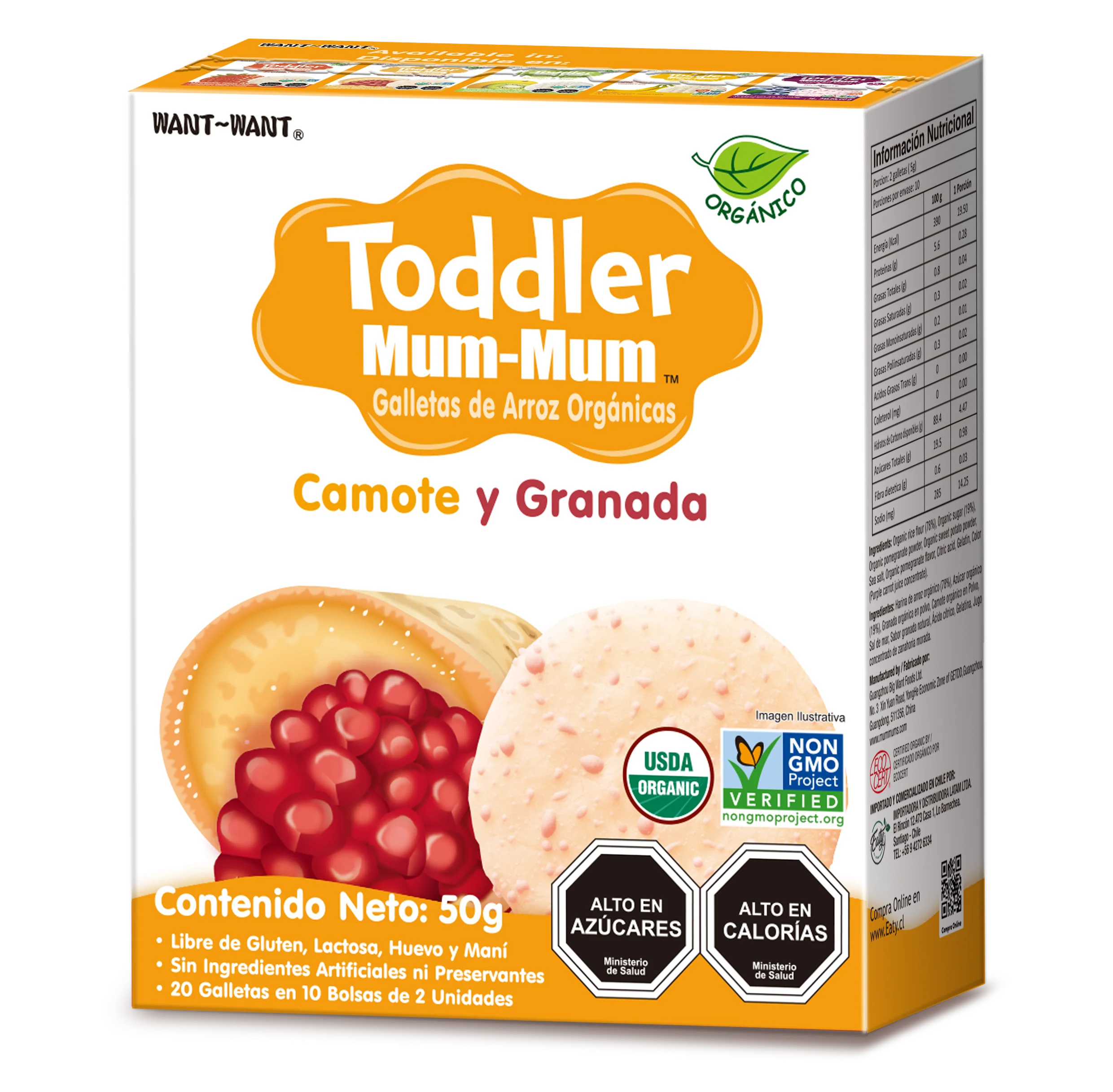 Una explosión de sabor para pequeños con personalidad. Las galletas Toddler Camote y Granada de Mum Mum están hechas para niños que quieren algo distinto: crujientes, con glaseado dulce y un sabor que combina lo natural del camote con el toque ácido de la granada. Orgánicas, limpias, sin ingredientes artificiales ni alérgenos comunes, son el snack perfecto para acompañar aventuras diarias.