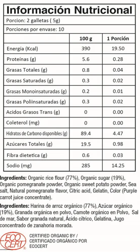 Harina de arroz orgánico (77%), azúcar orgánico (19%), granada orgánica en polvo, camote orgánico en polvo, sal de mar, sabor granada natural, ácido cítrico, gelatina, jugo concentrado de zanahoria morada.